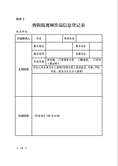 以各總支為單位擇優推薦紅色經典電影剪輯版視頻作品不少于1部,5月10日前將推薦的作品優盤以及《剪輯版視頻作品信息登記表》(附件2)、《剪輯版視頻作品上報匯總表》(附件3),按要求加蓋公章,同時將表格電子版、視頻百度網盤鏈接發送到指定郵箱jzdxxcb@163.com。