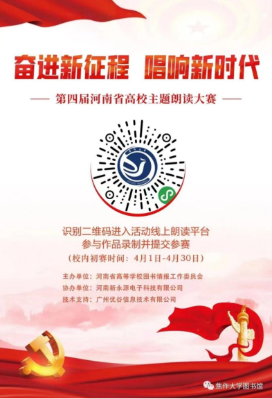 為深入貫徹落實習近平新時代中國特色社會主義思想,踐行黨的二十大精神,不忘初心、牢記使命,踔厲奮發、勇毅前行,開展讀書活動,建設書香社會。在第28個“世界讀書日”(4月23日)來臨之際,河南省高等學校圖書情報工作委員會決定舉辦第四屆河南省高校“奮進新征程·唱響新時代”主題朗讀大賽。