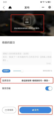 4. 朗讀完成后,點擊“完成”,點擊相冊添加喜歡的圖片或使用默認圖做封面,在“選擇活動”處確認提交至“奮進新征程·唱響新時代—第四屆河南省高校主題朗讀大賽”,點擊“發布”,即作品提交參賽成功。