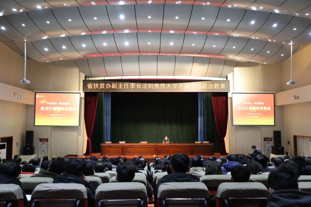 12月30日上午,河南省扶貧開發辦公室黨組成員、副主任李長法蒞臨焦作大學開展思想政治教育,為師生上了一堂精彩的思政課。焦作市委副書記劉濤、焦作市副市長武磊、省扶貧辦宣教處副處長王科、市扶貧辦黨組書記王國建、市脫貧攻堅辦主任呂慧欣、市脫貧攻堅辦副主任李艷芬、馬村區委副書記王婕等同志和學校領導、學校副科級以上干部及“青馬工程”培訓班學員代表一起聆聽了報告。報告會由焦作大學黨委書記魏曰高主持。
