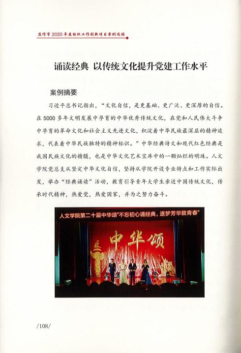 在全校評選表彰的基礎上,2020年12月,該校向焦作市委組織部推薦了法律與政治學院、人文學院、藝術學院黨總支的品牌項目。最終,人文學院“誦讀經典 以傳統文化提升黨建工作水平”成功入選“焦作市2020年度組織工作創新項目”載體創新類項目。