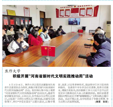2021年3月9日,河南教育周刊以《焦作大學積極開展“河南省新時代文明實踐推動周”活動》為題,對我校積極開展“河南省新時代文明實踐推動周”活動進行了報道。內容如下: