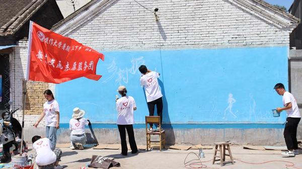 隨后,該校藝術學院成立了趣藝文畫志愿服務團,依托學院特色資源,發揮學生專業特長,組織青年學生來到焦作市山陽區墻南村開展了暑期安全教育宣傳及建設美麗鄉村墻繪等主題實踐活動。