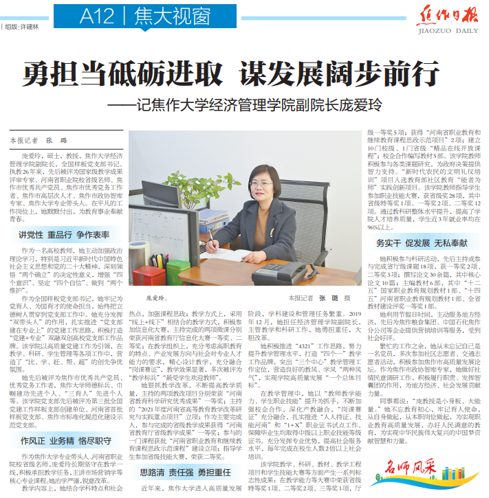 近日,焦作日報以《勇擔當砥礪進取 謀發展闊步前行》為題,對我校經濟管理學院副院長龐愛玲教授先進事跡進行報道。