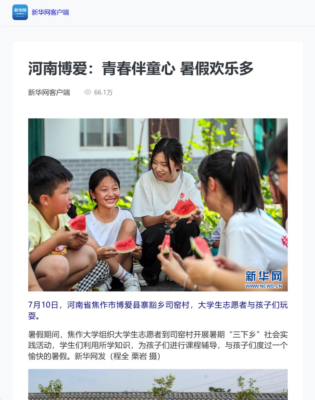 新華網客戶端對我校組織大學生志愿者到司窯村開展的暑期“三下鄉”社會實踐活動進行報道