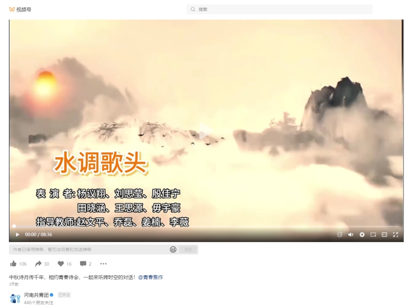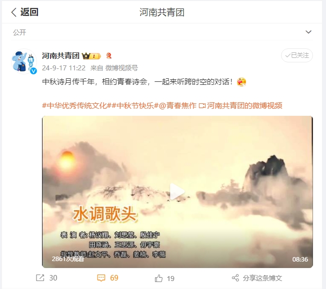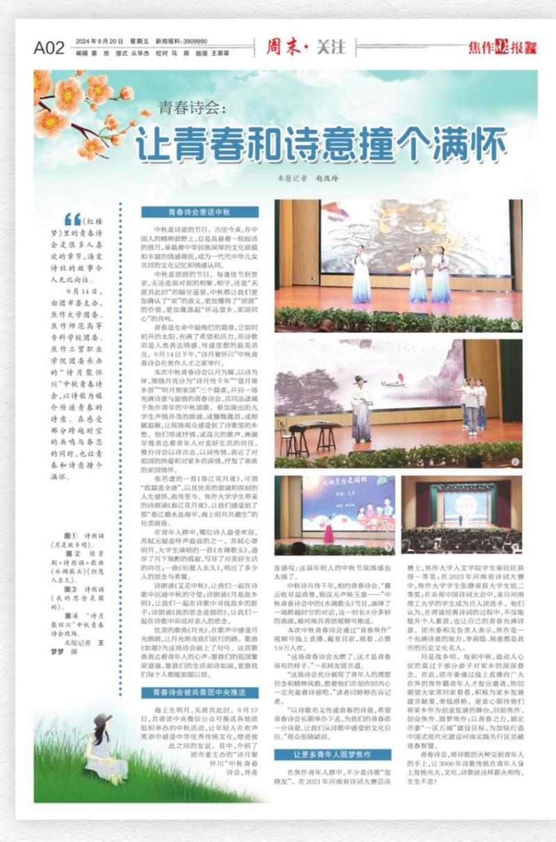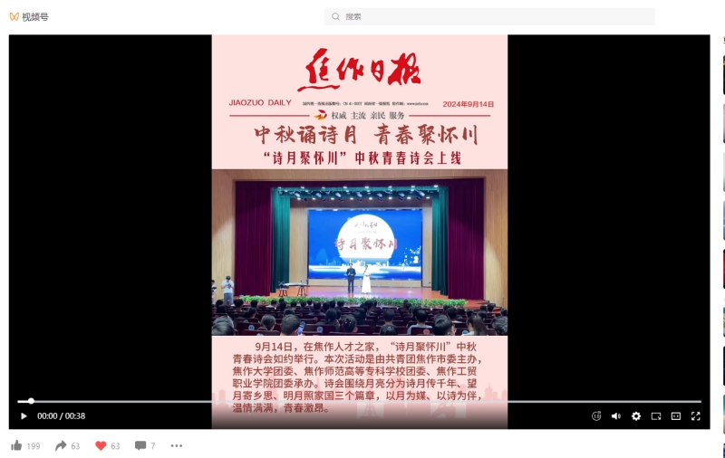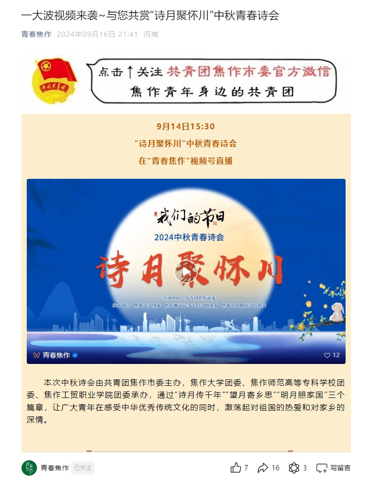 9月14日,共青團(tuán)焦作市委主辦的“詩(shī)月聚懷川”中秋青春詩(shī)會(huì)順利舉行,我校團(tuán)委作為第一承辦單位,負(fù)責(zé)詩(shī)會(huì)主持和第一篇章節(jié)目“詩(shī)月傳千年”的策劃演出,受到高度評(píng)價(jià)。共青團(tuán)中央微信公眾號(hào)、共青團(tuán)河南省委微博和微信視頻號(hào)、焦作市各大媒體對(duì)本次詩(shī)會(huì)進(jìn)行了宣傳報(bào)道。共青團(tuán)河南省委微博、微信視頻號(hào)單獨(dú)推送宣傳了我校所負(fù)責(zé)篇章的完整節(jié)目?jī)?nèi)容。
